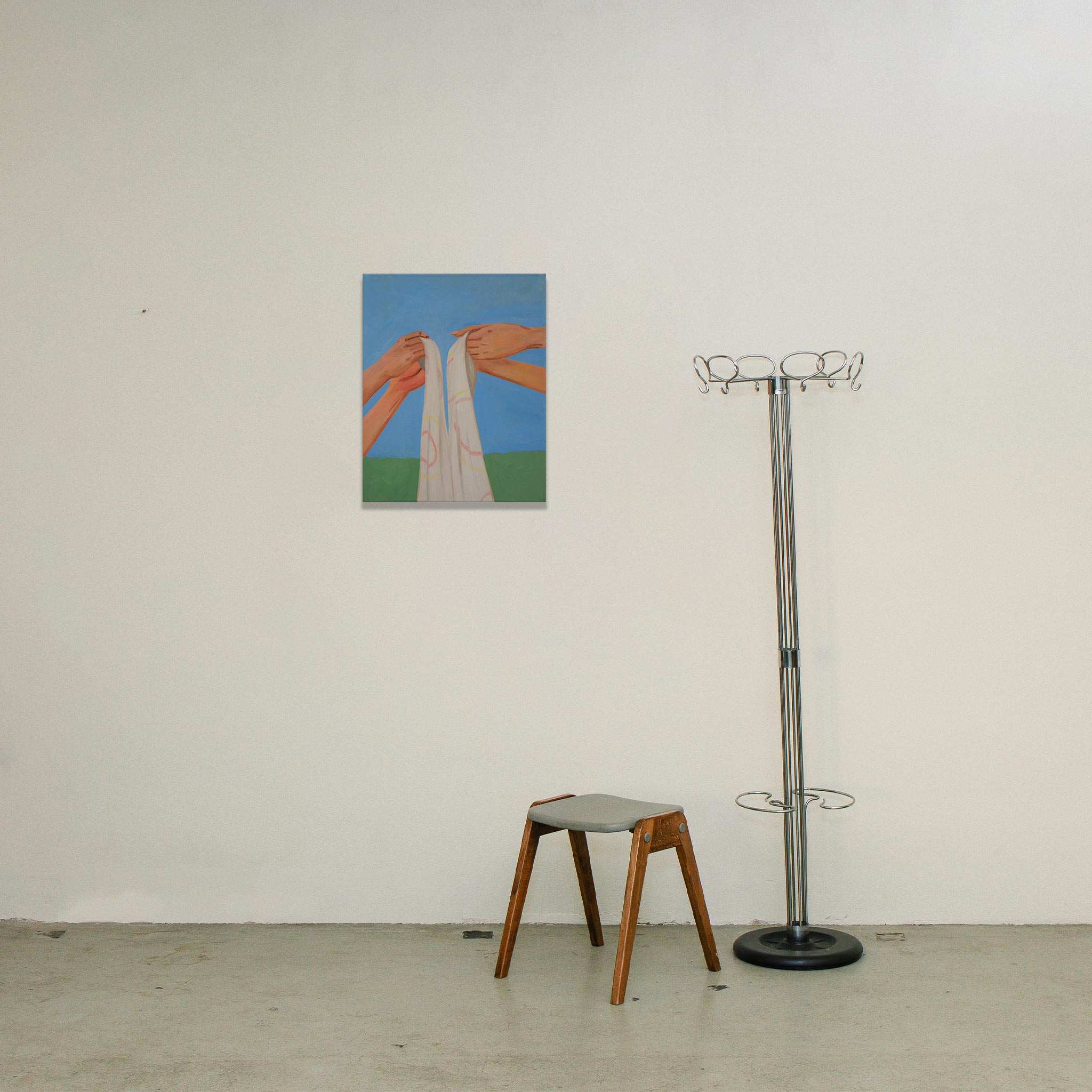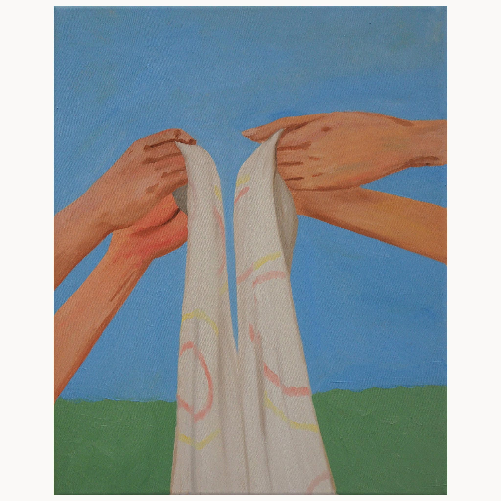 In diesem Werk (70 x 50 cm) fokussiert Jolanda Rendl auf eine spezifische Geste des Miteinanders: Zwei Paar Hände halten ein weißes Tuch – vermutlich das Ausschütteln oder Zusammenlegen der Decke nach einem Picknick. Vor einem strahlend blauen Himmel und angedeutetem Grün wird diese alltägliche Handlung zu einem fast rituellen Moment der Verbundenheit. Rendl isoliert die Geste vom Rest der Körper, was dem Bild eine universelle und symbolische Kraft verleiht.