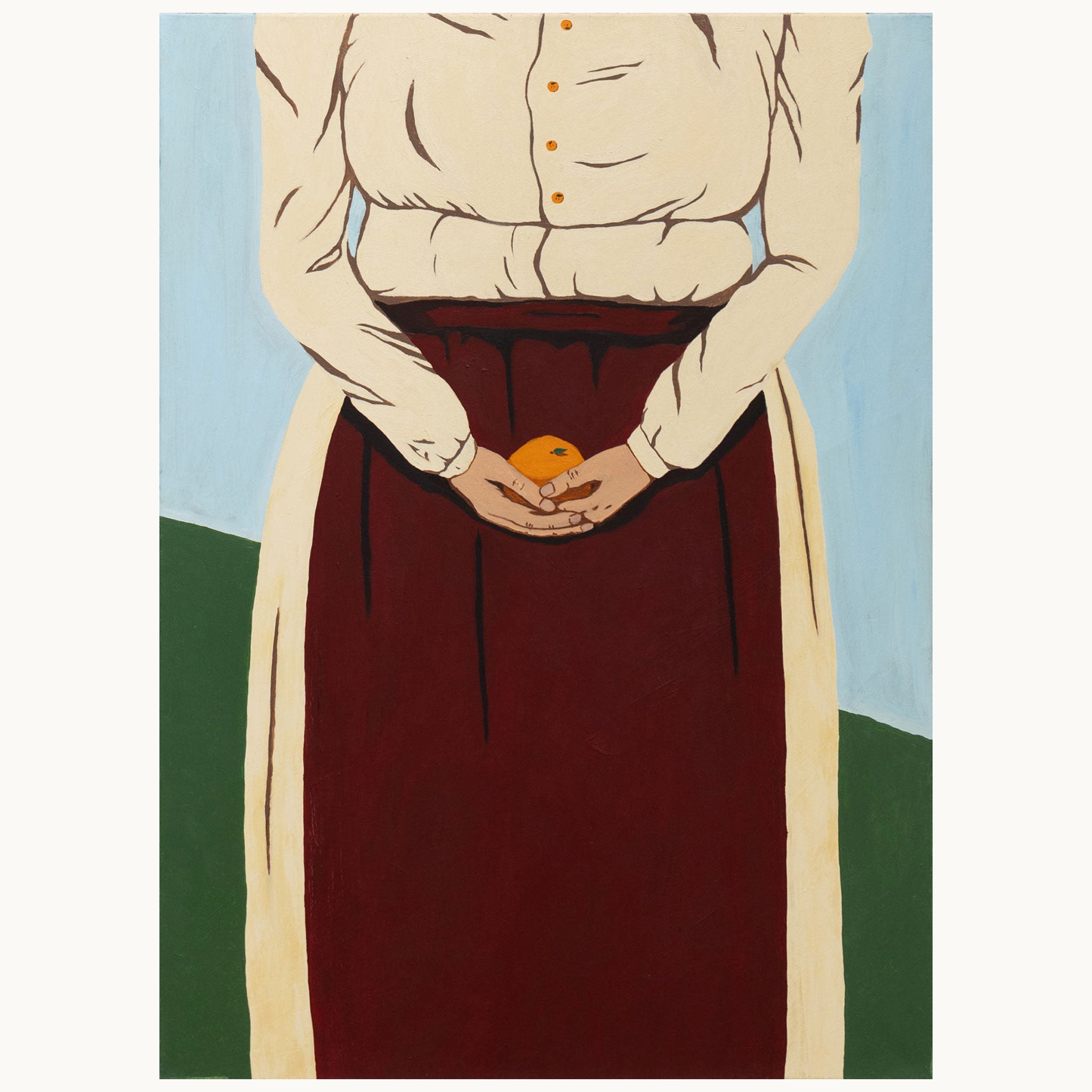 Mit diesem großformatigen Werk (110 x 80 cm) referenziert Jolanda Rendl visuell die Ikonografie der "Dust Bowl"-Ära, übersetzt sie jedoch in eine zeitgenössische, farbige Bildsprache. Im Zentrum steht die Geste des Haltens: Eine leuchtende Orange wird vor dem Körper präsentiert – ein Symbol für Hoffnung, aber auch für die Ambivalenz moderner Versprechen.