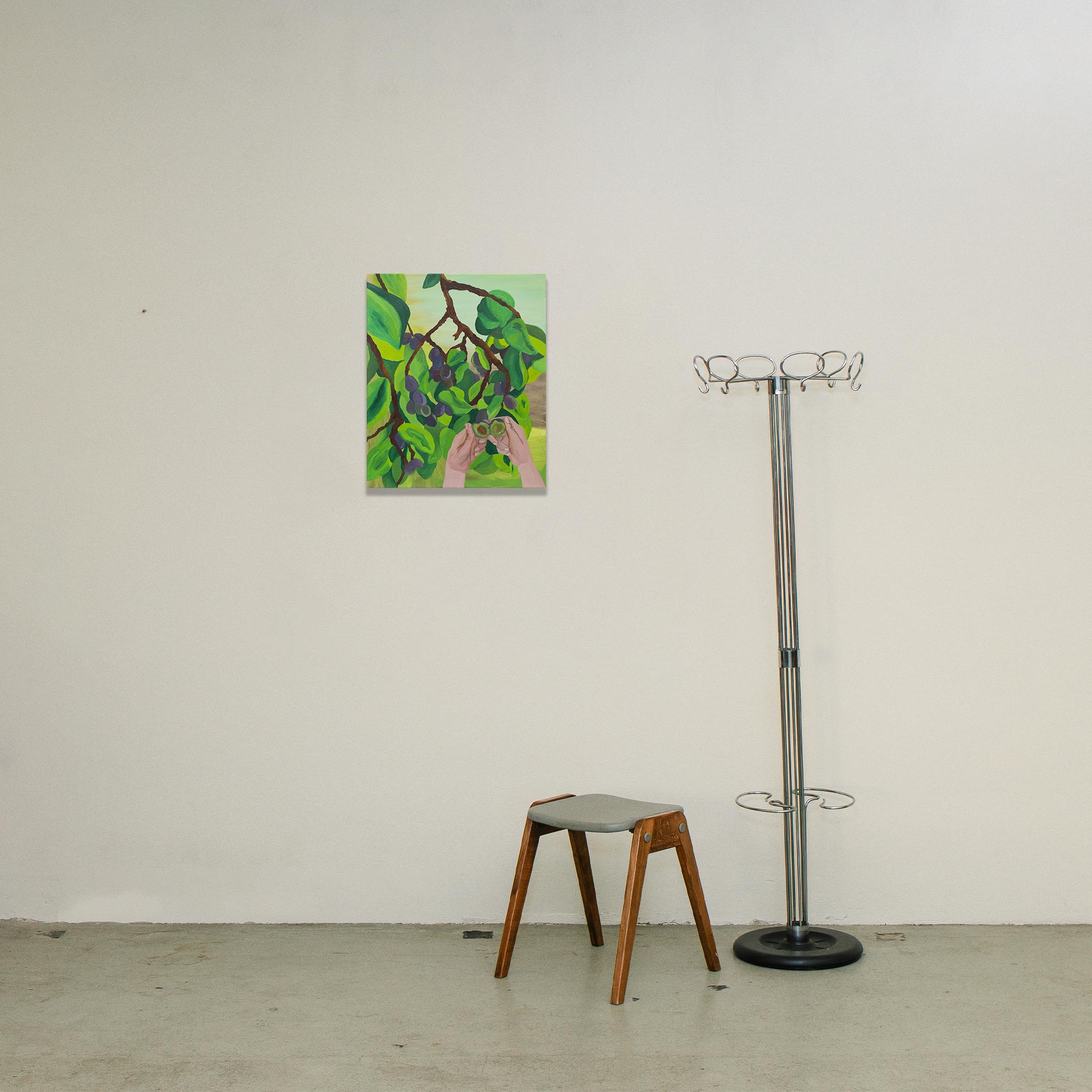 Mit "Zwetschken" (60 x 50 cm) schafft Jolanda Rendl eine malerische Parabel auf das Leben. Das Werk besticht durch seine leuchtenden Farben – sattes Grün und tiefes Violett – und lenkt den Fokus auf eine zentrale Geste: Das Öffnen der Frucht.