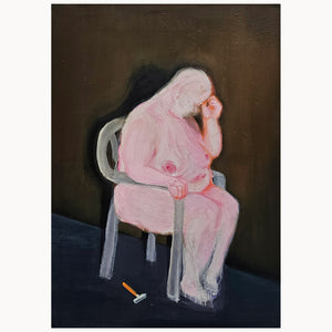 Die Frau in „God shave the queen“ ist nackt. Sie hat sich den gesamten Körper und Kopf rasiert. Haarlos und mit Glatze kauert sie auf einem Plastiksessel. Was hat sie dazu getrieben? Pia Weissinger lebt und arbeitet in Wien. Sie schloss ihr Studium an der Akademie der bildenden Künste in der Klasse von Daniel Richter 2025 ab.