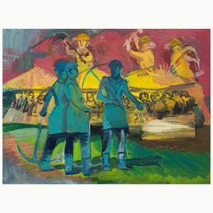 Mit Ironie und kunsthistorischen Referenzen, einer bewusst rohen, expressiven Bildsprache thematisiert Nikita Sukhov gesellschaftliche Hierarchien, vermeintliche „Normalität“. So etwa in „Lobster Mining“. Hier graben Frauen mit kräftigen Armen nach Hummern. Sie arbeiten fokussiert, in Kleidern und High Heels. Während sie abbauen und ausbeuten, steht hinter ihnen eine Tür offen — nach draußen. Ob sie die Tür sehen? Ob sie die Miene verlassen?