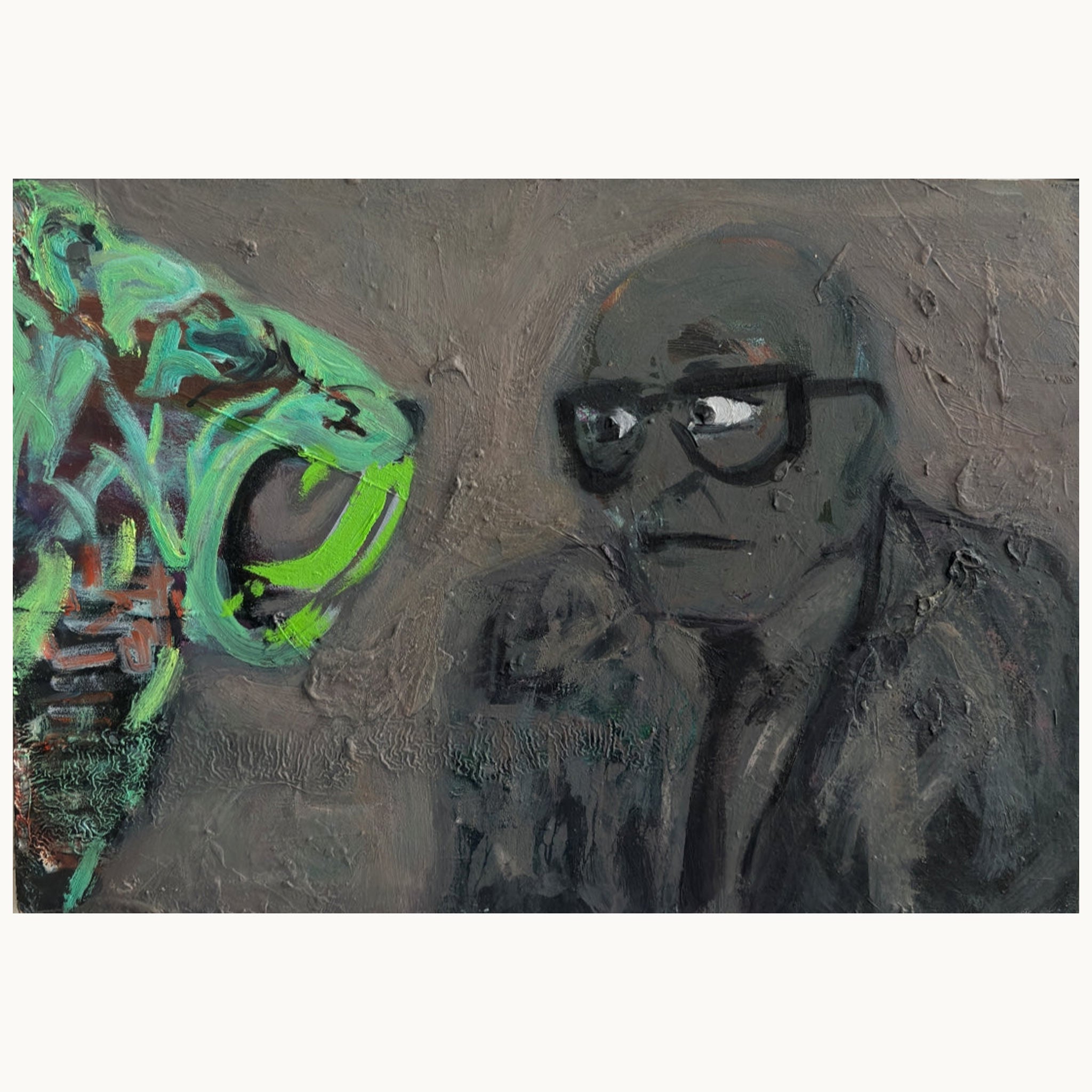 Auf 34 x 49 cm sehen wir eine spannungsgeladene Begegnung. Eine in Grau gehaltene Figur fixiert einen leuchtend grünen, zähnefletschenden Tigerkopf. Der Titel, eine Referenz an den absoluten Willen zum Kampf, wird hier psychologisch aufgeladen. Ist der Tiger eine reale Bedrohung oder ein innerer Dämon, dem man ins Auge sehen muss?