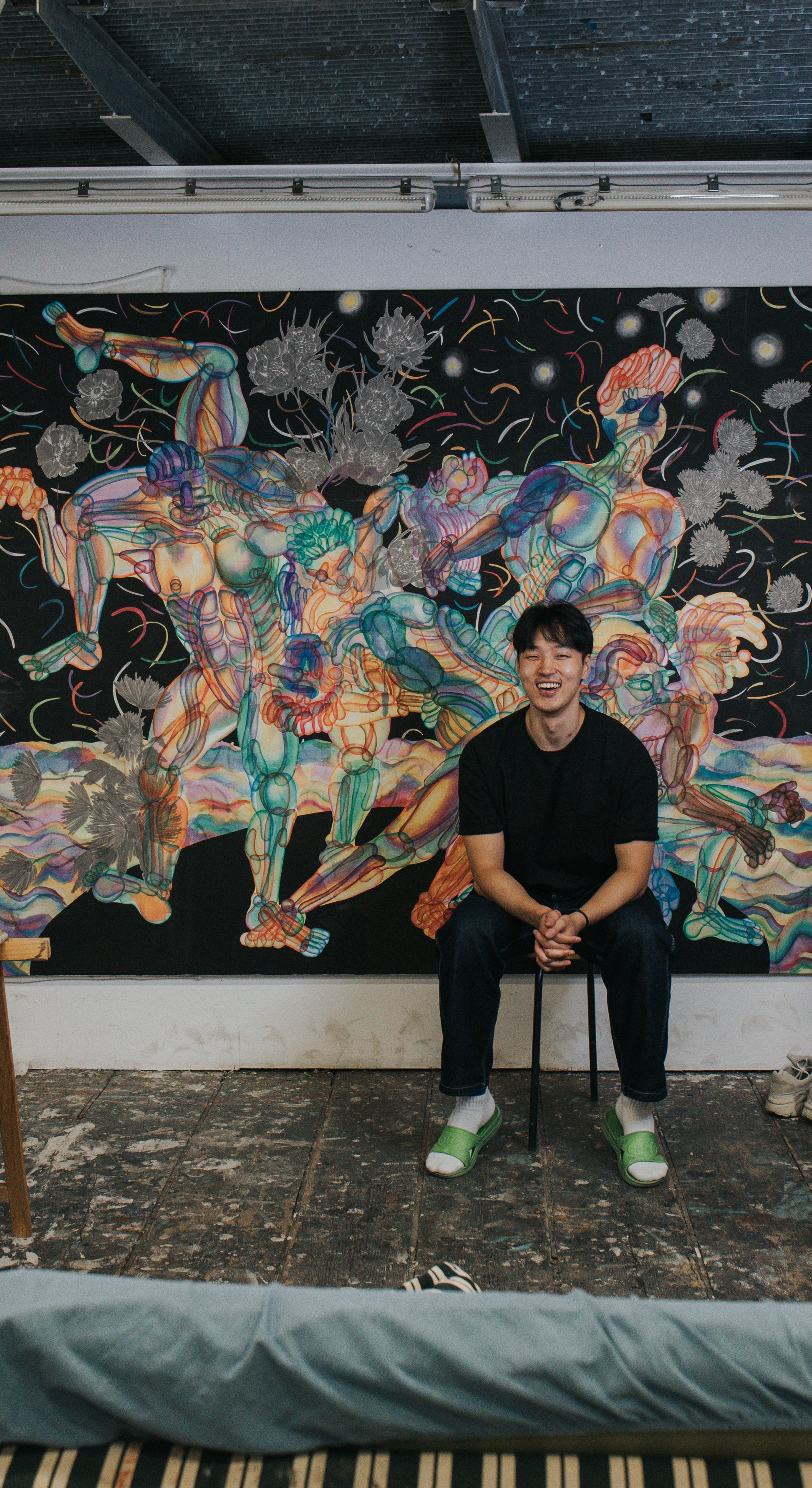 June(Hwajung Kim), born in 1991 in South Korea, is currently studying at the Academy of Fine Arts in Vienna, in the class of Daniel Richter. His work is profoundly shaped by his identity as an Asian, non-native speaker, and queer man navigating European culture. Through performance, installation, and painting, June delves into the complexities of human duality, examining the way desire and emotions manifest themselves within intimate spaces.